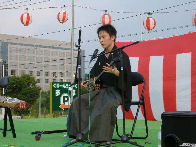 途中、後ろに背負った三味線のカバンが開き、
