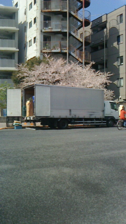 引っ越しのトラックに桜。春ならではの光景です(^_^)
